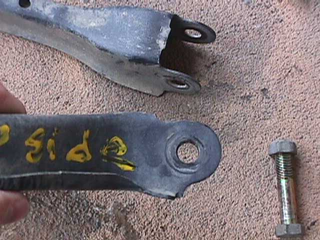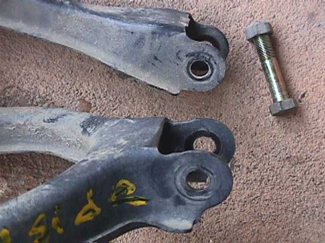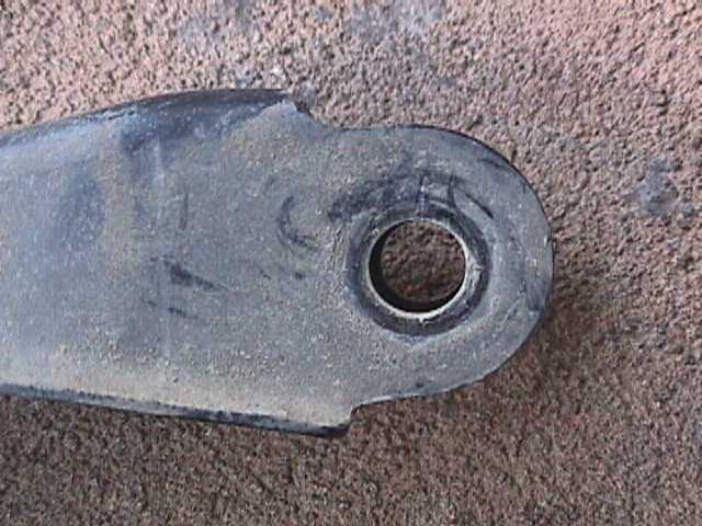 Most of the time when lowering a 240, at least with the S-13 body style you tend to have camber problems. Now if you go more than 1.5in, then you will probably need a fix for the rear. Camber is degree in which your tires contact the road, and if its not 0 or there about, you will get bad tire wear. The process to correct this is quite simple and really only involves either a good alignment shop or you and a plasma cutter. The upper control arm(the one the rear shock goes through) needs to have the hole where it connects with the back of your rear hub slotted out. Also the same thing must be done with the other upper control arm in order to allow your toe in to be set with the stock adjustment. The pictures below will help illustrate what I mean. SPECIAL THANKS to Kyle for taking these pics of his used set of control arms for us .